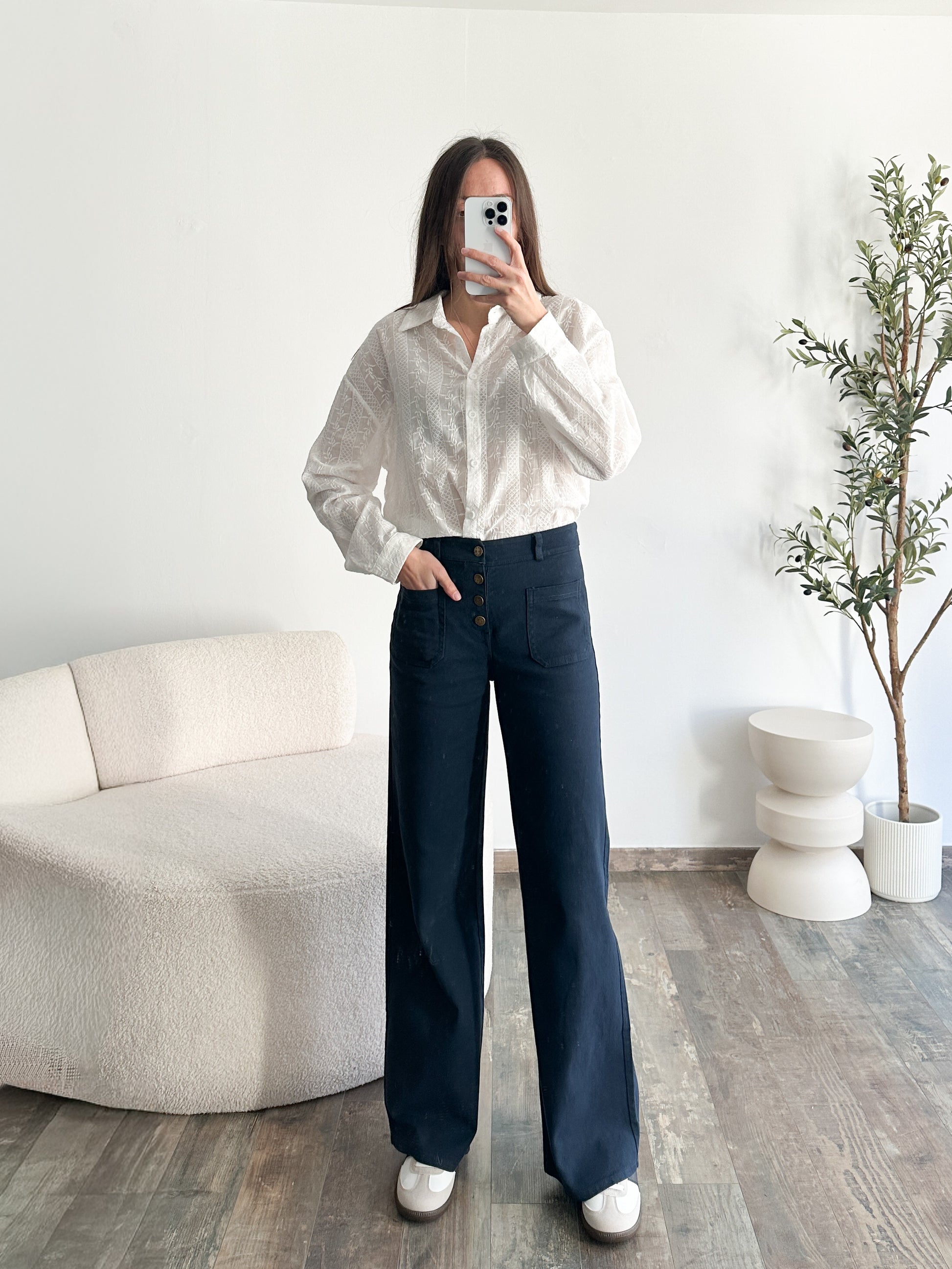 Jean très confortable avec poche sur le devant et boutons. Evasé en bas