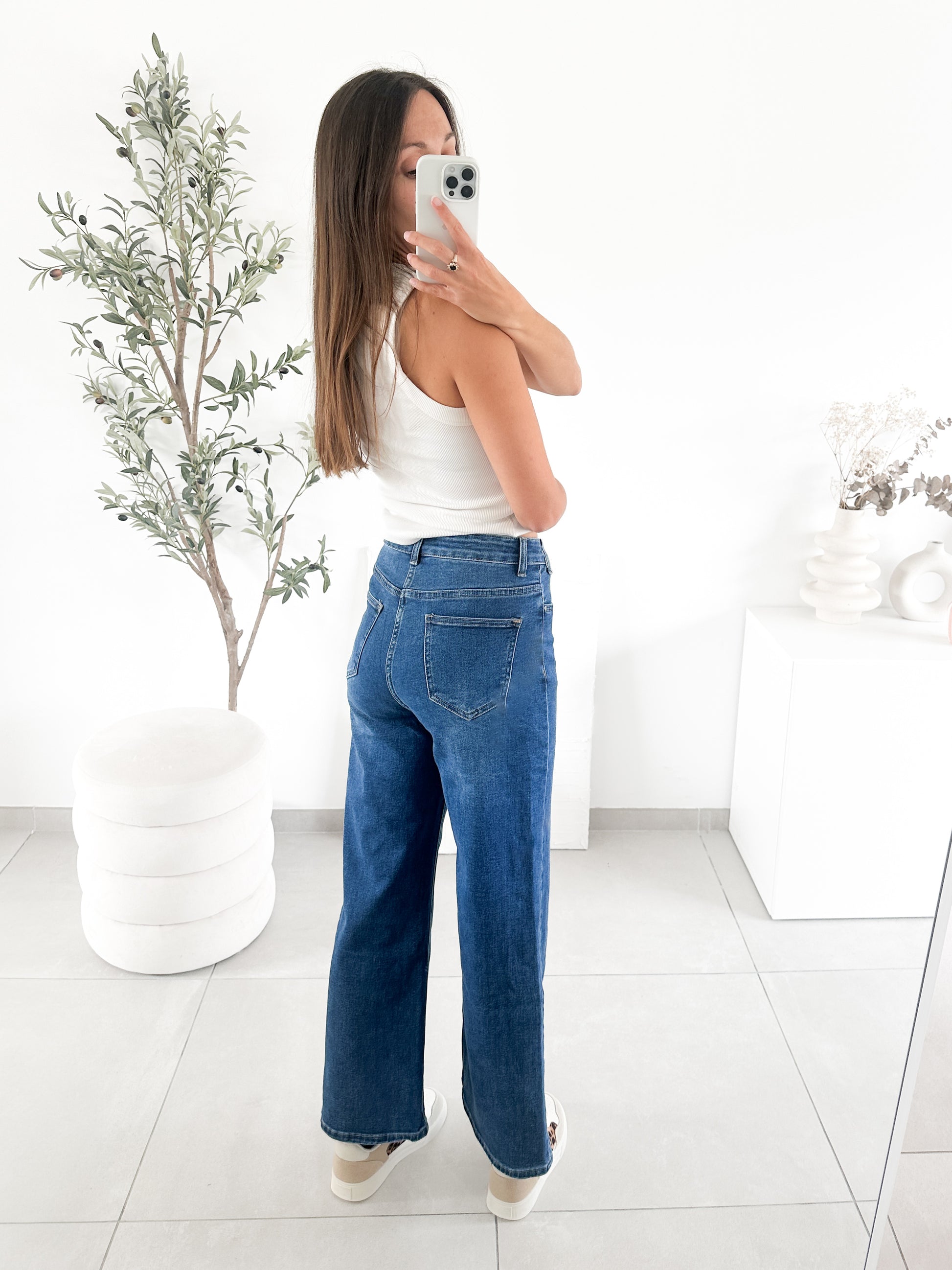 Jean coupe wide leg très confortable. Matière élastique. Fermeture éclair décentrée.